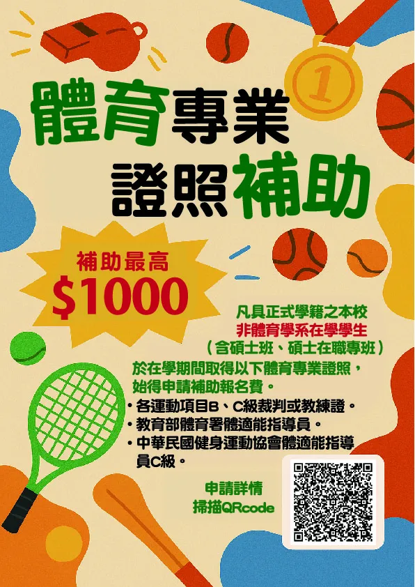 於在學期間取得以下體育專業證照,始得申請補助報名費。
